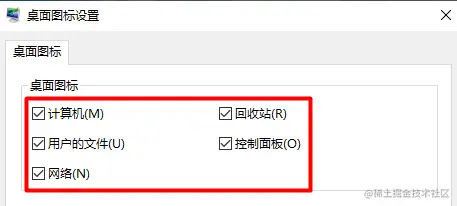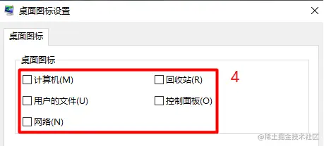 Win10桌面图标显示问题 代码的路 2022-08-19 98 阅读1分钟 原文链接 Windows 桌面图标出现模糊、阴影等显示问题。 解决办法 1.在桌面上鼠标右键→个性化→主题→桌面图标设置→把计算机 回收站 用户的文件 控制面板 网络等全部不选 2.然后在桌面新建文件夹,把桌面所有的图标剪切到新建文件里面,然后把新建文件夹剪切到其它盘里,这时桌面没有一个图标了 3.重启电脑,右键个性化→主题→桌面图标设置,把复选框全部勾选上,把剪切走的图标剪切回来 4.若出现部分图标变白,可以在卸载时选修复解决 学习更多编程知识,请关注我的公众号: 代码的路