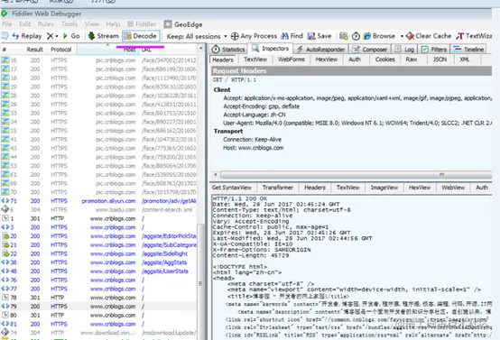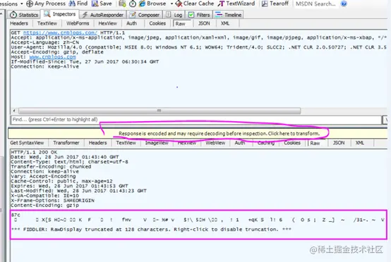 fiddler中Response出现乱码, 这是因为HTML被压缩了, 我们可以通过两种方法去解压。