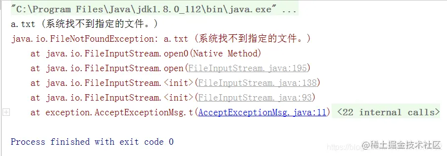 - 捕获异常:当Java运行时环境收到异常对象时,会寻找到能处理该异常对象的catcah块,如果找到合适的catch块并把该异常对象交给该catch块处理,这个过程被称为捕获异常;如果Java运行时环境找不到捕获异常的catch块,则运行时环境终止,Java程序退出;