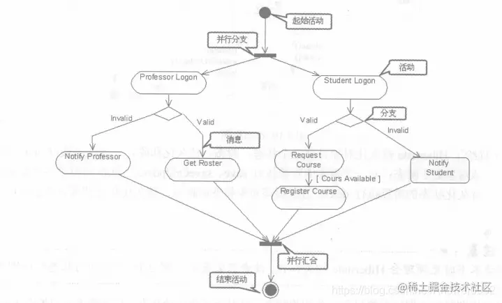 - 活动图:用于描述用例内部的活动或方法的流程,若除去活动图中的并行活动描述后,就变成了流程图;