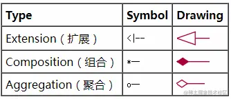 - 关联(包括聚合,组合):聚合用带空心菱形框的实线表示,组合用带实心菱形框的实线表示;