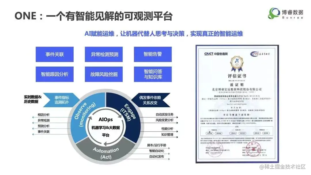在银行业的多年积累,博睿数据具备了信息、经验、智能决策融合的智能见解能力,能够基于AI和规则自动发现问题,实现根因分析——智能见解——故障预测——故障修复等一系列智能分析过程,预置经验规则和AI共同提出见解,发现问题并给出根因,解决虚假问题扰乱运维、告警风暴、根因定位效率低的问题,助力运维人员快速排障,提出解决办法,进而提高运维效率。