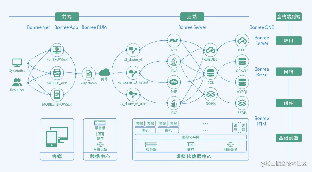 作为行业内唯一覆盖所有DEM监测方式的厂商,博睿数据可通过主动模拟监测和全样本抓取真实用户数据帮助银行优化业务体验。从前端运行、网络质量、后端处理三个维度来定位问题,主动了解平台运行状态,并基于用户访问数据,收集真实用户使用中的性能异常等相关问题,进而帮助银行业提升用户体验。