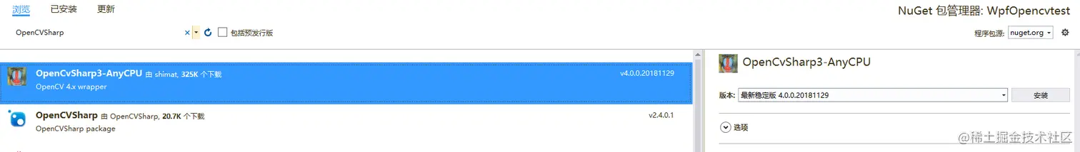 然后,在Nuget上搜索OpenCVSharp,如下图:
