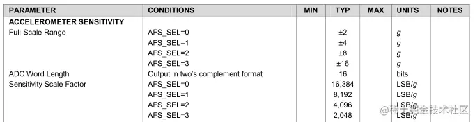 2、MPU6050采用16位的ADC采样。16位的ADC采样是什么意思?举个例子:如果量程选择(通过寄存器选择)是±2g,16位的ADC采样,表示的含义是用65536(即2的16次方)种情况去表达-2到+2g的情况。如下datasheet截图显示,AFS_SEL=0,表示±2g量程,当数据寄存器的数据为16384,对应表示受到1g的力。例如:数据寄存器读取到的值为X,对应受到的力的大小为Y,则Y=X/16384,单位是g。
