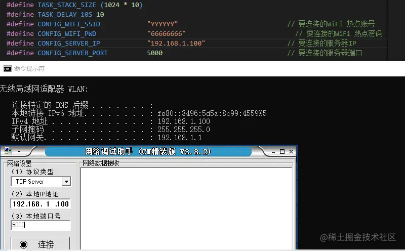 (2)BearPi-HM Nano开发板程序设置的IP,电脑的IP,网络调试助手服务端的IP,三者保持一致,如下图"192.168.1.100";