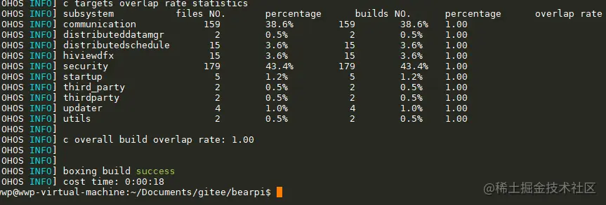 5、输入hb build -f,开始编译,编译成功后,会在根目录下的out/bearpi_hm_nano/boxing目录生成Hi3861_wifiiot_app_allinone.bin,如下图: