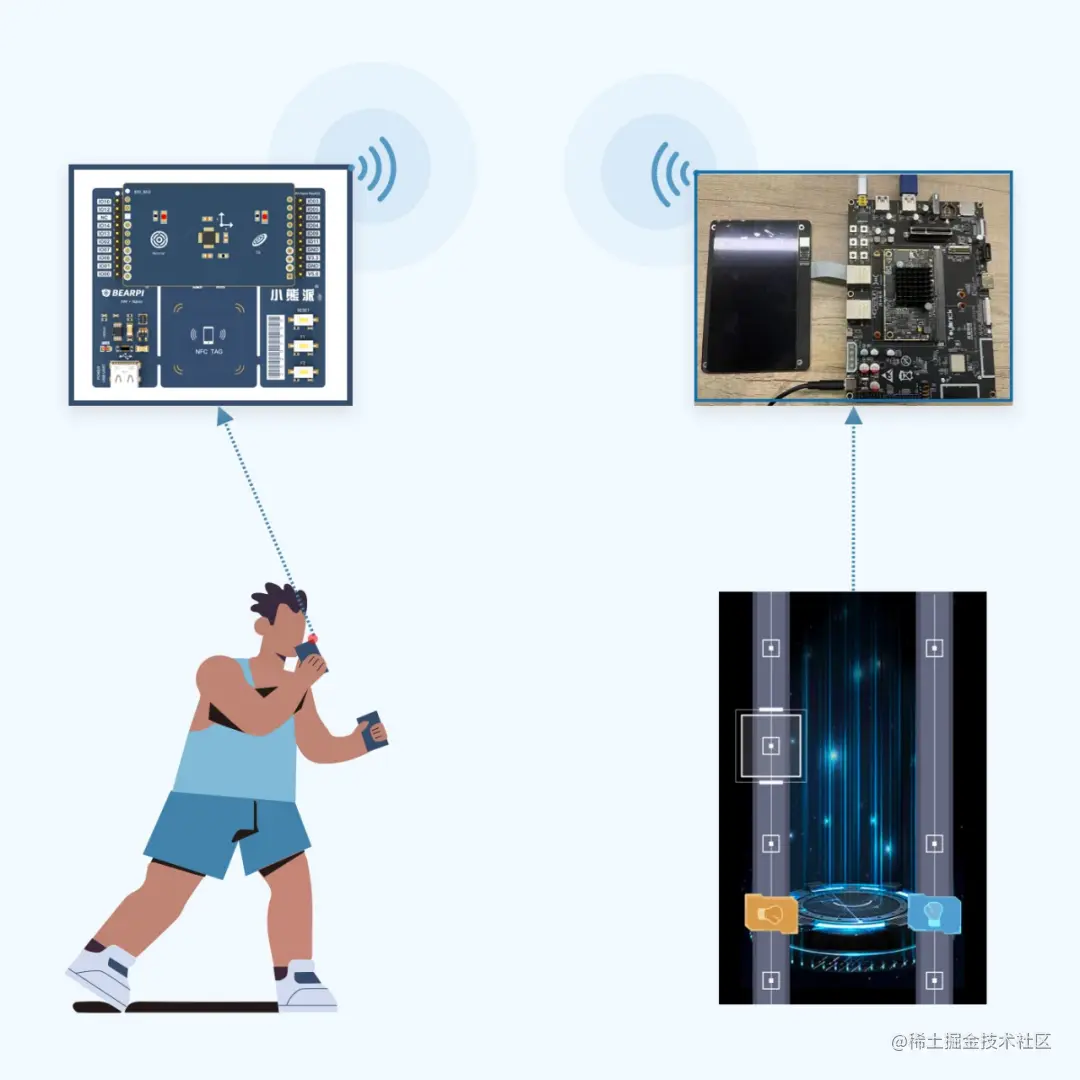 如下图,左侧为设备端,右侧为应用端:开发者手握设备端小熊派开发板,观察屏幕,根据应用端APP显示,在指定的时间完成挥拳动作;挥拳信息经无线传递到应用端,应用端APP对挥拳时机有相应的计分规则,最后统计出总分。