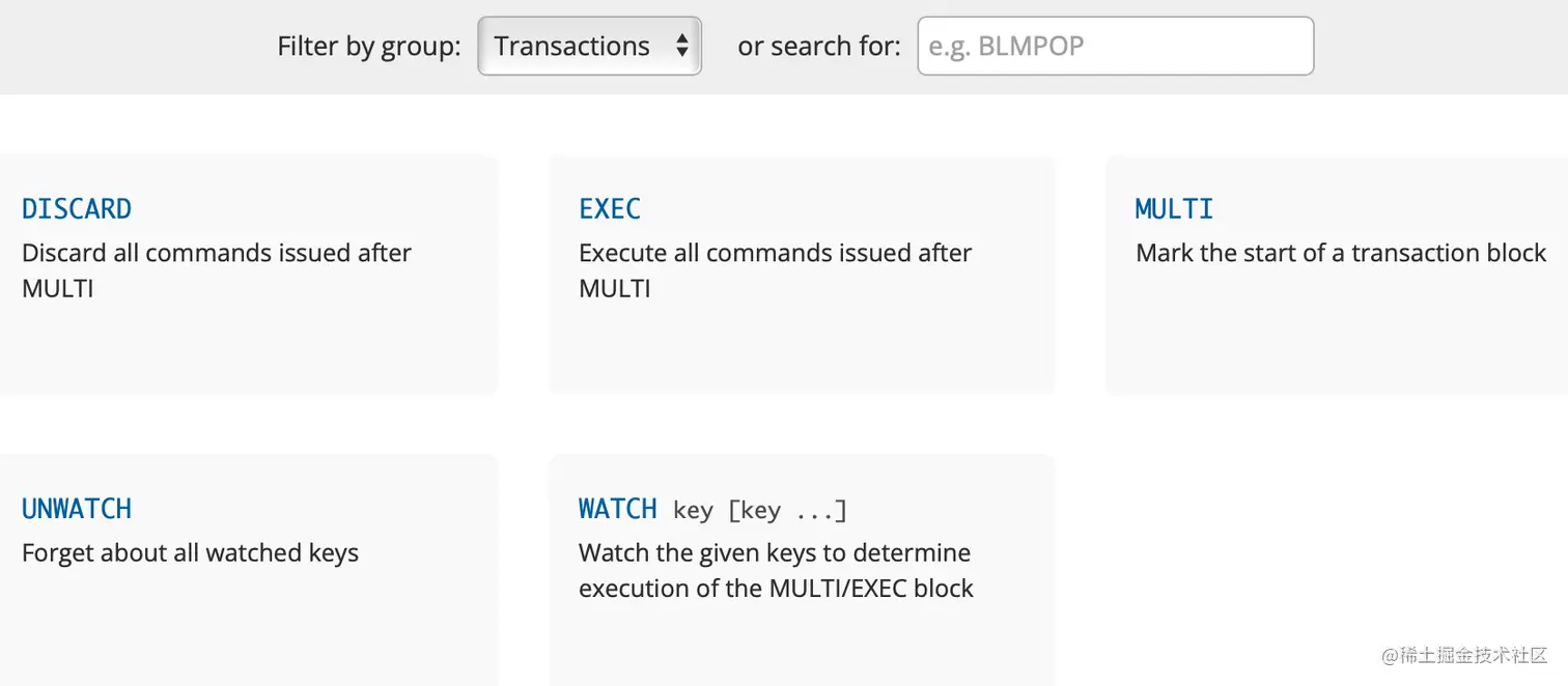 Redis提供了事务相关的5个指令,分别是:DISCARD、EXEC、MULTI、UNWATCH和WATCH。如下图所示: