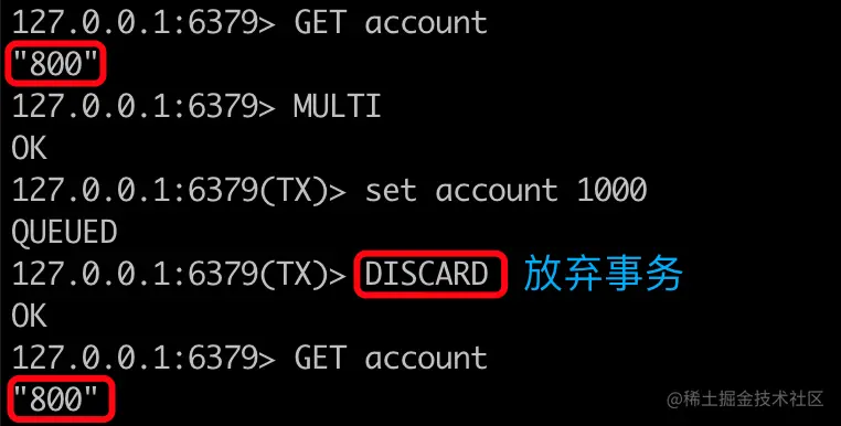 操作逻辑:刷新一个事务中所有在排队等待的指令,并且将连接状态恢复到正常。如果已使用WATCH,DISCARD将释放所有被WATCH的key。