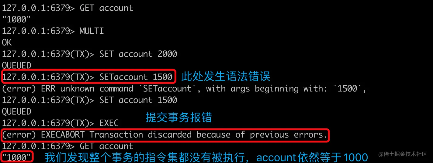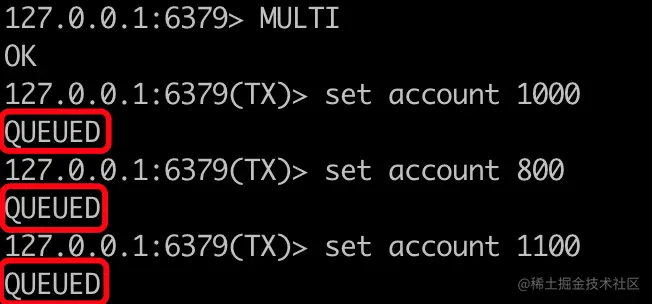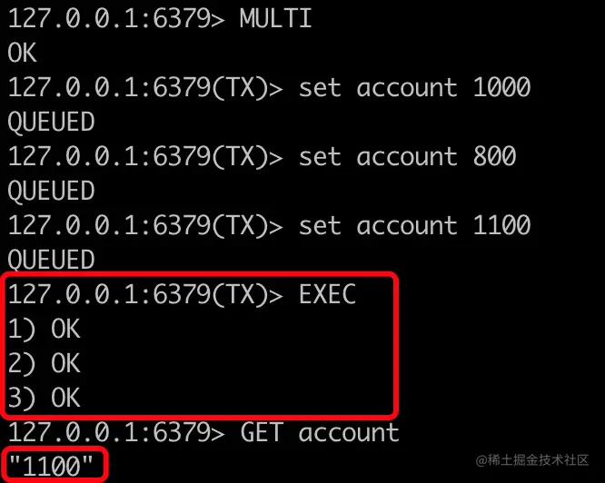 调用完EXEC之后,正确执行的都会返回OK,并且当我们再次查询account里面的金额的时候,也正确的返回了1100。这就说明,一个事务内的指令是按照顺序执行的。