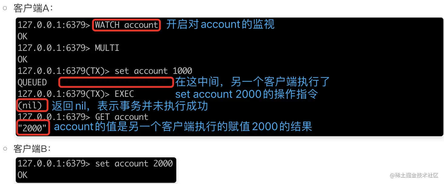 操作解释:当执行了EXEC指令之后,watch就被隐式的执行了unwatch。如果需要再次监控,就需要再次调用WATCH指令。