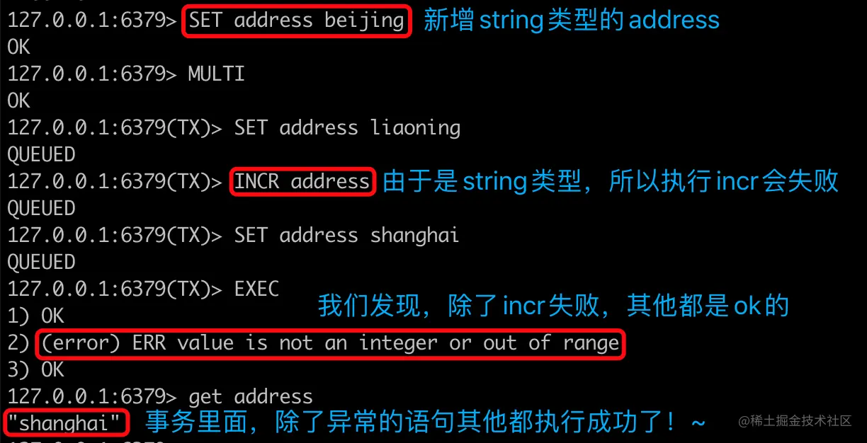 针对执行中的异常,只会导致该条指令的执行失败,而不会影响事务中其他的指令