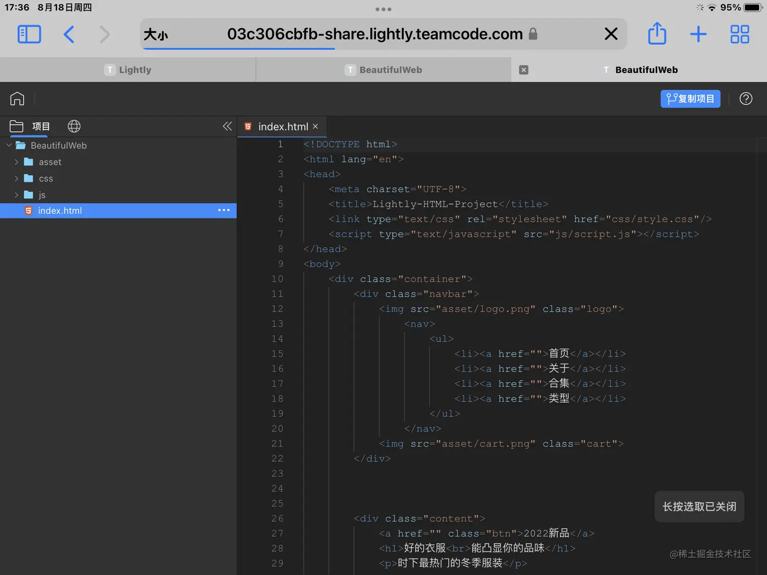 打开Lightly的HTML在线编辑器后,我们可以在项目面板上新建HTML项目,然后再从左侧项目栏中上传所需要的素材。直接使用素材和代码包打开项目快照的小伙伴,也可以点击“复制项目”把整个项目的所有内容复制到自己的项目面板中。
