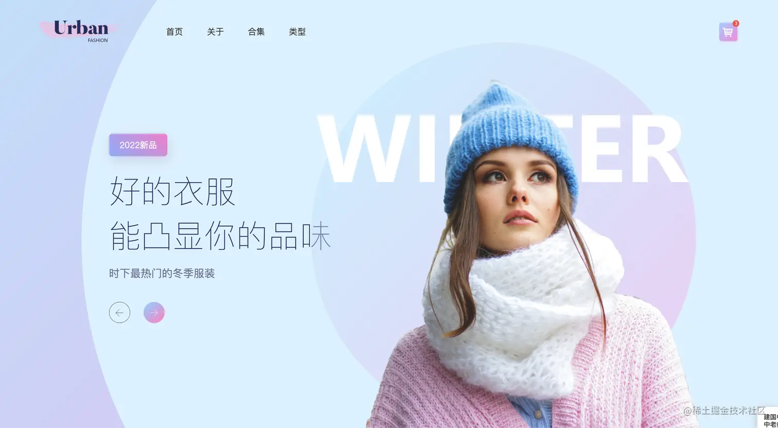在导航栏中,我们分别放入网页 LOGO、导航链接文本和购物车图标。其中,<nav> 标签即导航栏标签,我们可以在里面设置清单和链接文本。