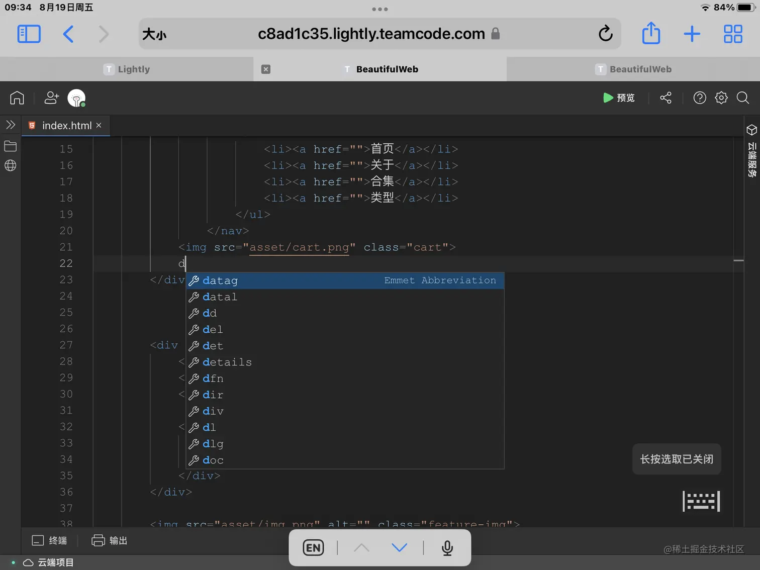 在 Lightly 中,我们只需要打出部分关键字,就可以使用 Tab 来自动填充代码。在 iPad 上也可以哦!