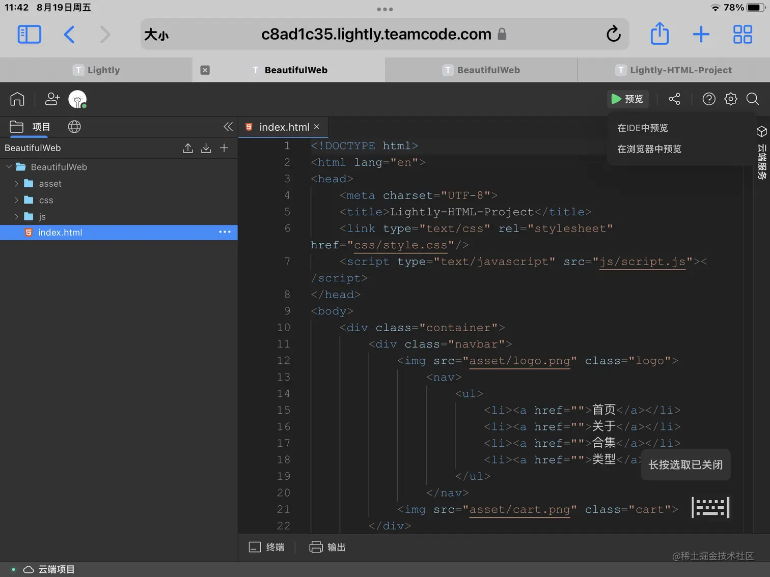 如果是直接新建空白项目的小伙伴,大家打开项目后会发现里面已经内置了 Hello World 的基础模板。点开 HTML 文件后,可以直接在 IDE 内的屏幕右侧预览网页效果,在 iPad 中也可以直接上传设备中的文件。