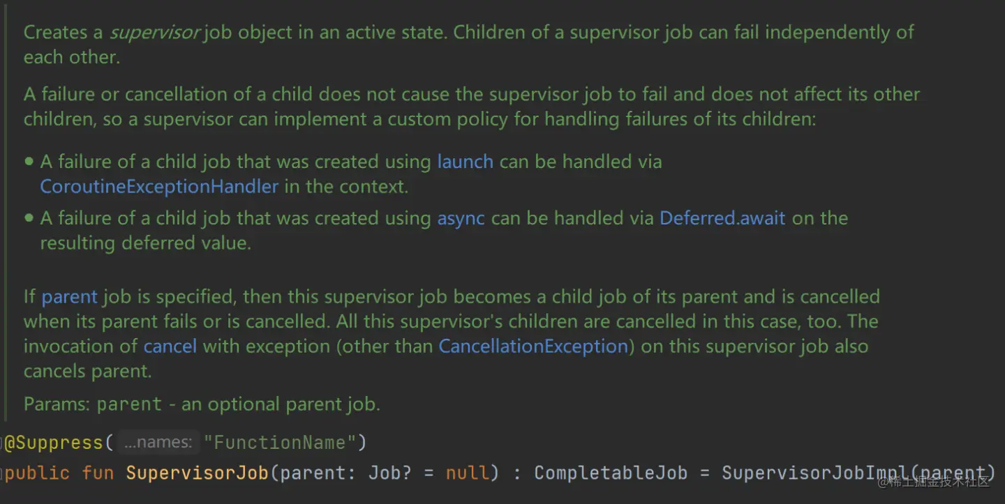 答案就是使用 SupervisorJob,或者用基于它的 supervisorScope。它不会把异常往上抛,也不会取消掉其它的子 job。但是,SupervisorJob 对 launch 和 async 启动的协程的态度是不一样的,它的源码注释里写明了的,简单的认为它会吃掉异常是会踩坑的。