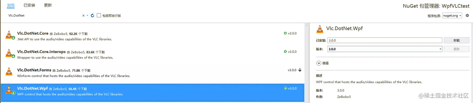我们选择Vlc.DotNet.Wpf,点击安装(这里我已经安装了,所以图中显示为卸载)。