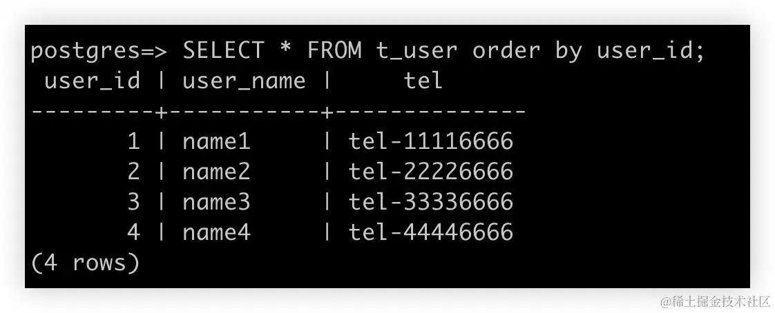 The application considers ShardingSphere + PostgreSQL instances to be a distributed database and treats ShardingSphere similarly to PostgreSQL. From the user perspective, there is only one logic table, namely t_user. However, this table is made up of four actual tables, from t_user_0 to t_user_3, which are located in two different PostgreSQL instances.