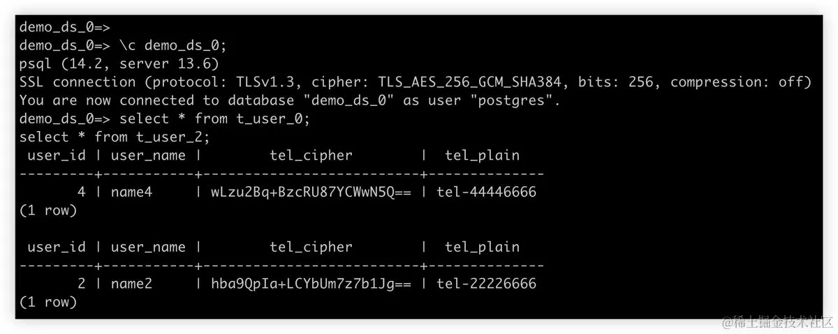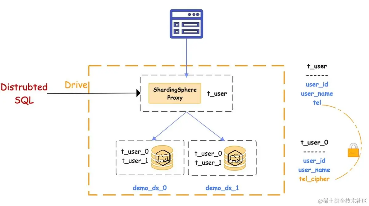 ShardingSphere-Proxy executes all of these processes in the background, greatly simplifying your life as a user, only requiring you to deal with the logic table t user with a logic column tel. However, before running a SQL query, users shall guide ShardingSphere on how to shard and encrypt data.