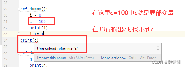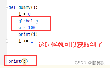 在下列代码 c = 100 中c就是局部变量,c 是在函数内容定义的,在函数外是获取不到的