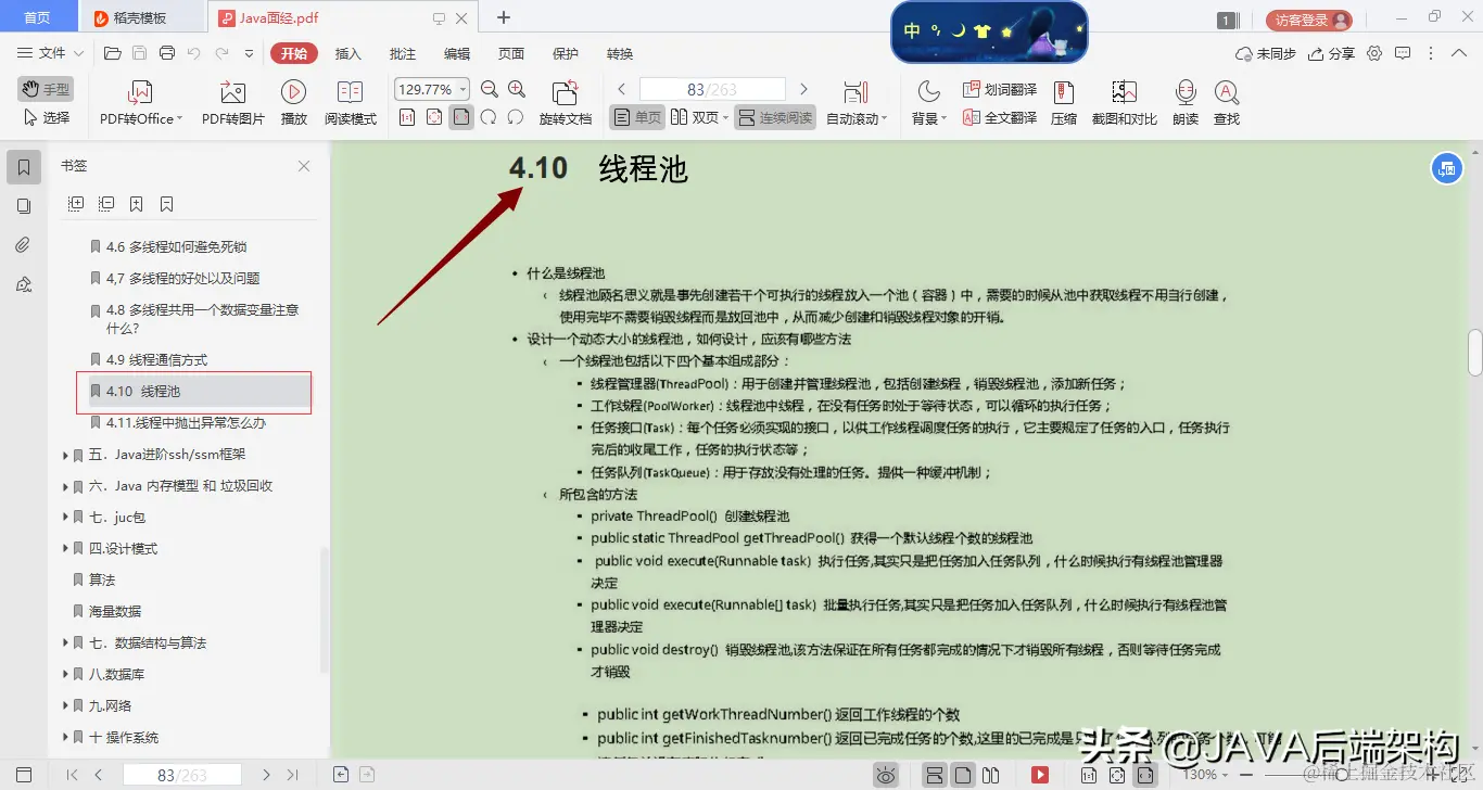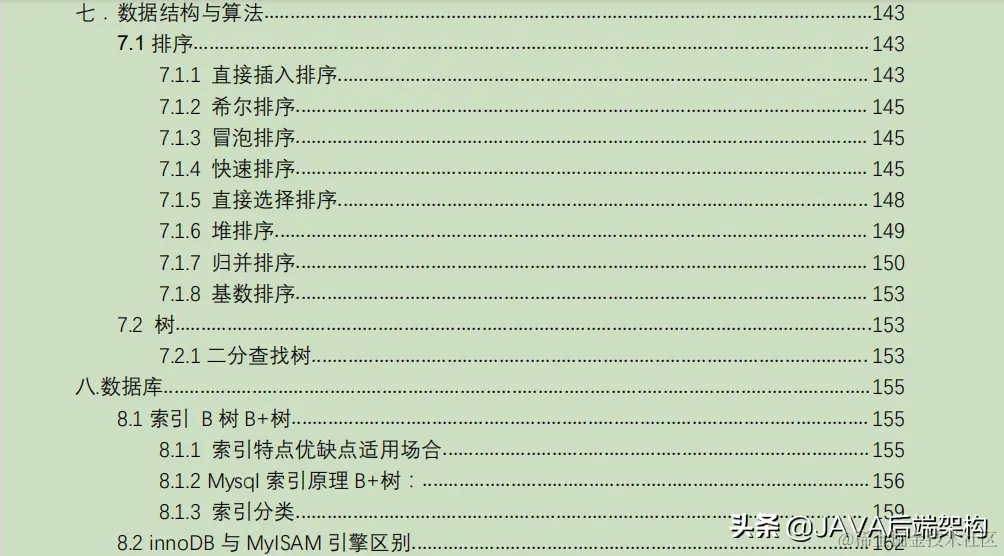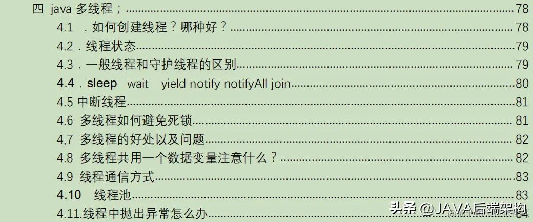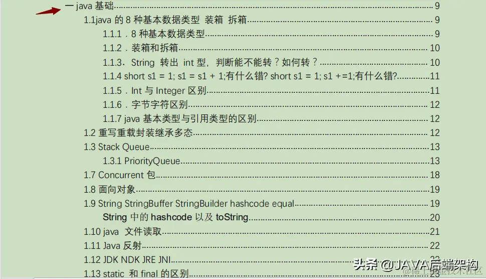 以上就是这份pdf的目录。里面涵括了各个java面试中常见的知识点及试题和面经