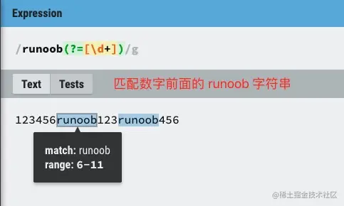 - 正向先行断言:(?=表达式),指在某个位置往右看,所在的位置右侧必须匹配表达式。
