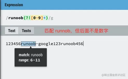 - 反向先行断言:(?!表达式),指在某个位置往右看,不能存在表达式中的内容。