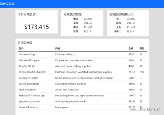 下图是一个产品开发中非常常见的大屏展示界面示例。 通过Vue提供的Vuex,上方三个仪表板以及下方的表格组件共享同一个数据源,已经实现了数据改变后同步响应更新。