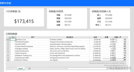回到Dashboard.vue文件,加入刚刚创建的SalesTableBySpreadjs组件。 然后重新运行,即可显示电子表格数据: