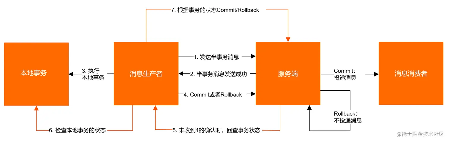 - 二次确认结果为Rollback:服务端将回滚事务,不会将半事务消息投递给消费者。