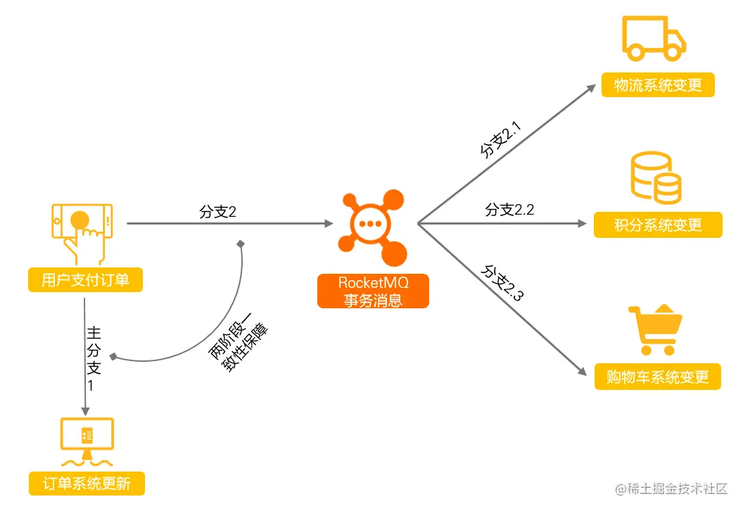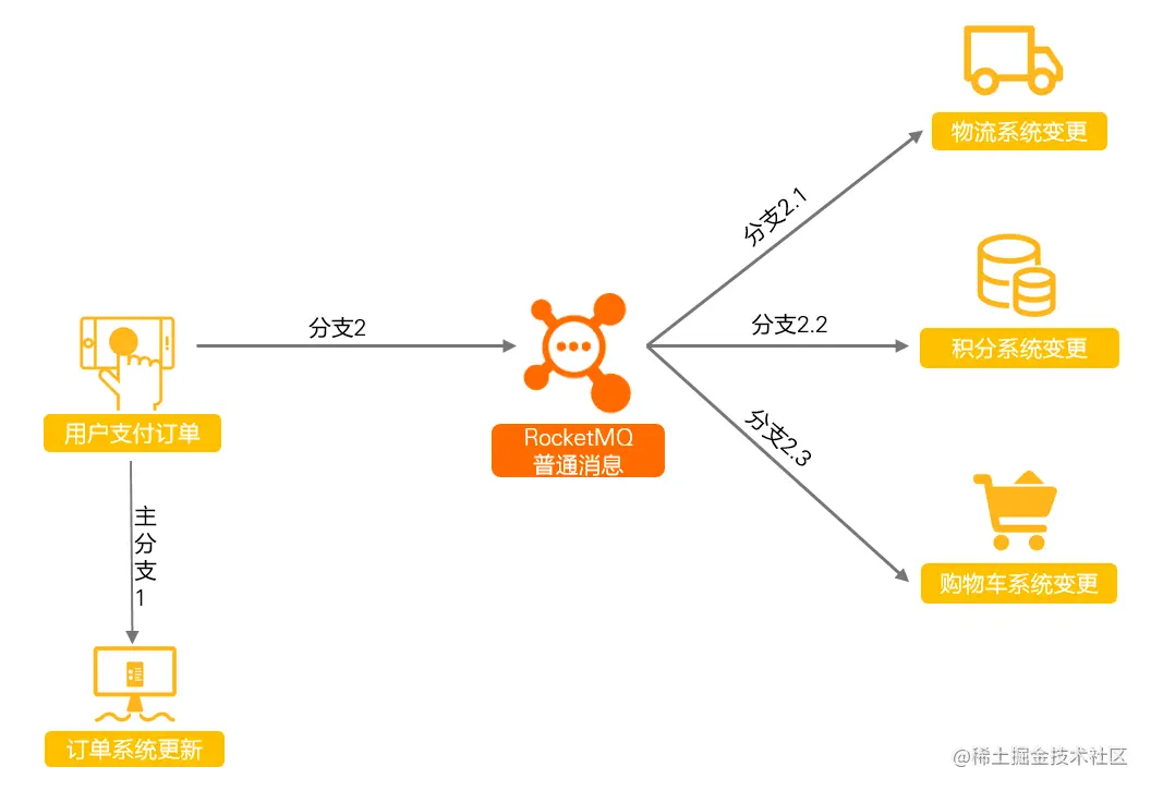 以电商交易场景为例,用户支付订单这一核心操作的同时会涉及到下游物流发货、积分变更、购物车状态清空等多个子系统的变更。当前业务的处理分支包括: