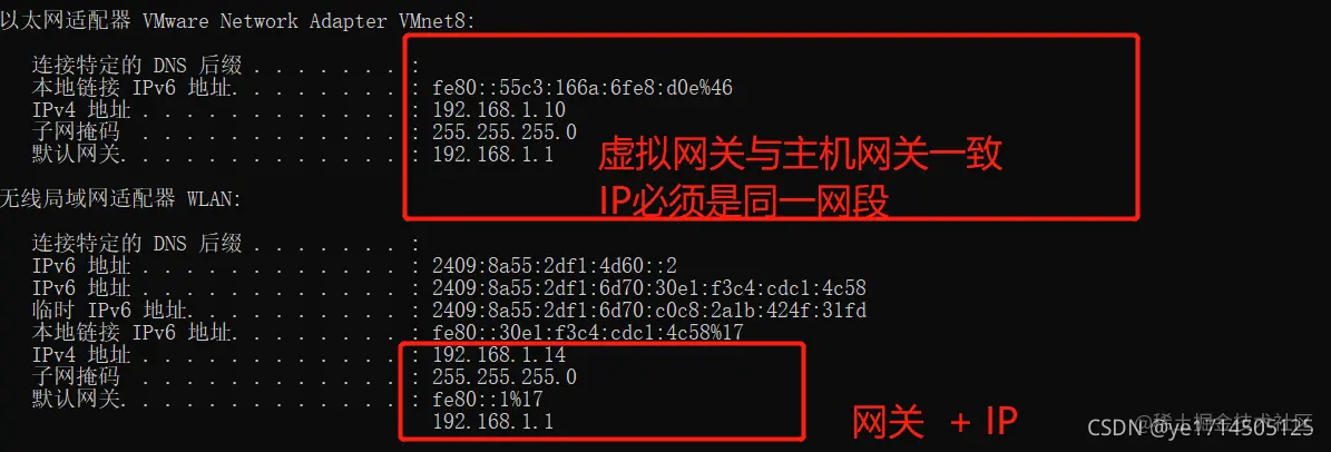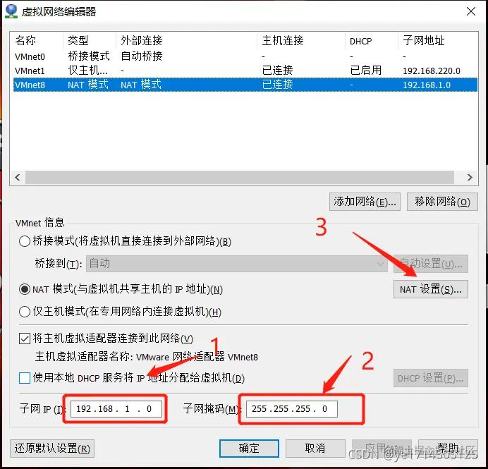 VMnet8的IP地址,需和本地的IP属于同一网段,网关必须相同 。