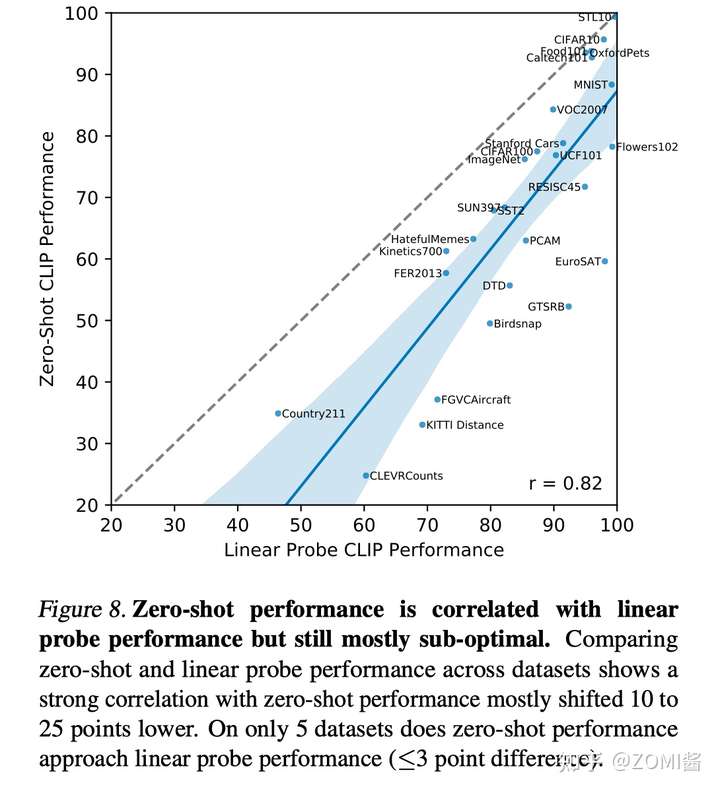 这里不再是few-shot linear probing了,而是全量数据的linear probing,我们来看下其跟zero-shot性能的对比,实际上两者的性能是正相关的,此外,大部分情况下linear probing的性能要好不少。