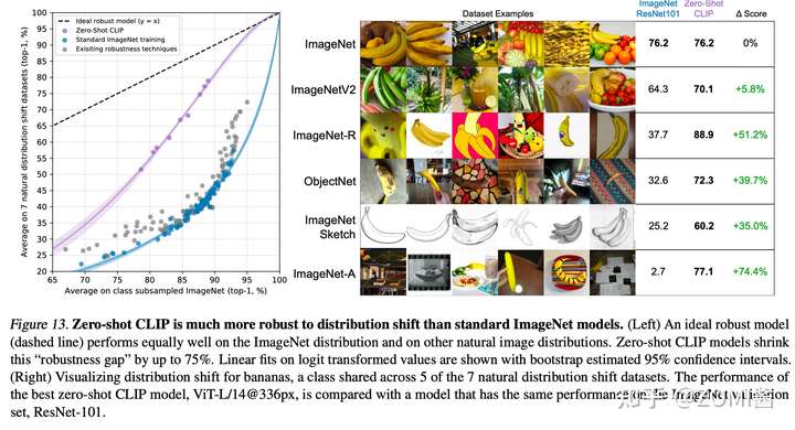 从图中可以看到,在不同的数据集上,CLIP 对比通用的 ResNet50 精度超过的有16/27,已经很强了,因为CLIP是zero-shot的,即没有用下游任务的数据,而linear probed ResNet50用了下游数据进行finetune逻辑回归分类器的参数。