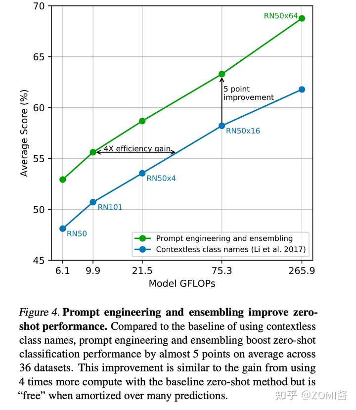 可以从实验结果发现,采用 Prompt engineering + ensembling 的效果比只用没有上下文的类别名好得多。