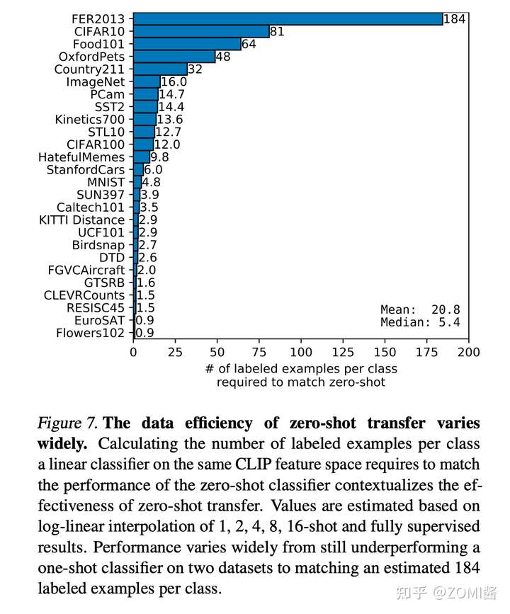 Few-shot (linear probing) CLIP (保持CLIP encoder 参数fixed,加一层逻辑回归分类器微调)平均需要 20.8-shots 才能 match zero-shot CLIP 性能。这里相当于保持了 the same CLIP feature space 上,观察 few-shot finetuning 和zero-shot 的性能差异。这里其实说明通过自然语言学到的视觉概念比少量样本 finetune 学到的好。