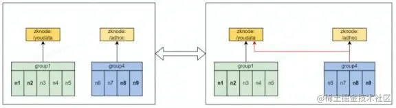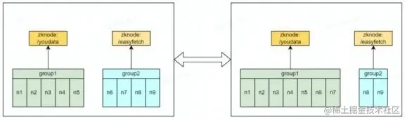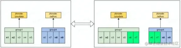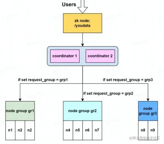 图中,n1n2 为 group1 节点组 coordinator 节点,其会注册到 zookeeper 路径 youdata 上,Hive JDBC 客户端从该路径获取任意 coordinator 节点向其提交查询,coordinator 将查询进行解析,优化并指定分布式执行计划,最终下发给 n3n7 执行。n6n7 同时还是 group4 的 executor 节点,group4 的 coordinator 为 n8n9,其会接收从 zookeeper 路径 Ad-Hoc 进入的查询,指定分布式执行计划,并会发送到 n6~n8 上。