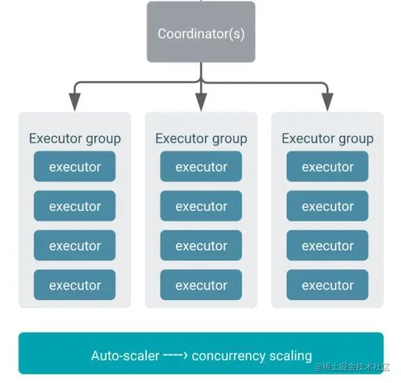 下图是 CDP 文档中关于 Impala 执行组的示意图,执行组是 Impala 进行弹性伸缩的基本单位,用户可以配置执行组规格 (XSMALL, SMALL, MEDIUM, or LARGE)。若启用自动伸缩,则 CDP 每次会按指定的规格扩展或缩小 Impala 的 executor 节点个数。