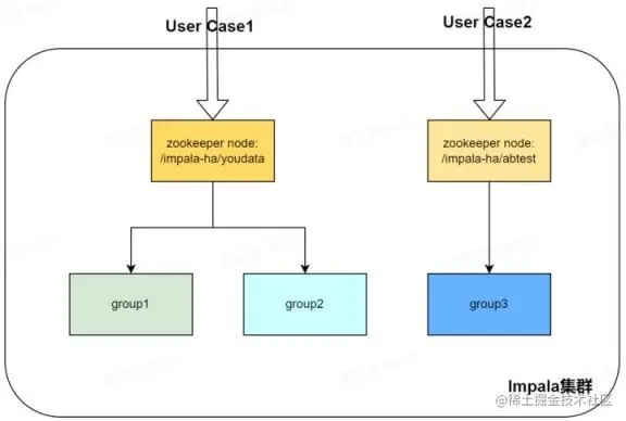 上图所示 Impala 集群有 2 个虚拟数仓,对应的节点组分别为 group1 和 group3,承接的业务分别是业务的有数 BI 报表和 ABTest 场景。假设 group1 为原分组,有 3 个 impalad 节点(1 个 coordinator,2 个 executor)。新增分组 group2,也是 3 个 impalad 节点,使用与 group1 相同的配置,即可起到水平扩展的效果。