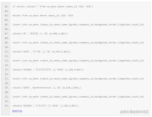 注意:预置前请先确认模块标识(cSub_Id)是否存在 其中,预置菜单数据的SQL语句脚本示例如下: