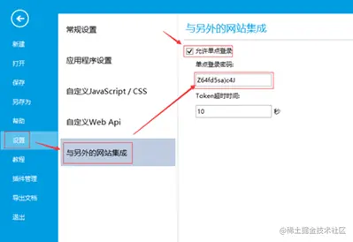e) 单点登录密码获取: 点击【设置】-【与另外的网站集成】按钮,勾选允许单点登录,将单点登录密码配置到GC_MENU表的SSO_Password字段。