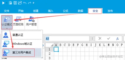 a) 设计器 点击【安全】-【认证模式】-【第三方用户集成】按钮,修改应用认证模式。