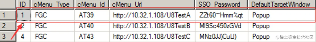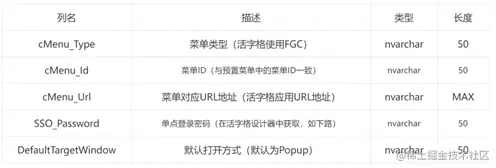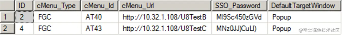 d) 预置菜单属性 表名:UFSYSTEM库 GC_MENU表 配置U8菜单对应的URL地址,单点登录密码以及默认打开方式。cMenu_Id保持与U8菜单ID一致。DefaultTargetWindow使用默认值即可。