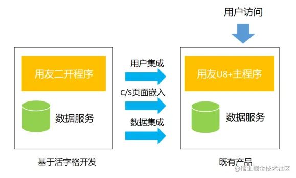 下面我们看看如何将程序集成到用友U8+的程序中来,集成的内容主要包括:数据集成、C/S页面嵌入、用户集成。