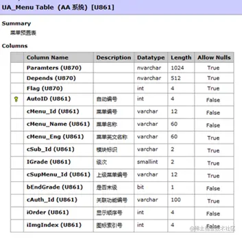 b) 预置菜单 表名:UFSYSTEM库 UA_MENU表 U8业务导航中看到的菜单需要预置在UA_MENU表中,该表结构如下图: