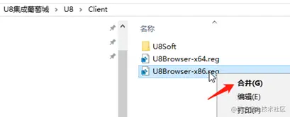 (3) U8客户端环境准备 请合并 \U8\Client\ 文件夹下的注册表项文件(*.reg)文件。如果操作系统是32位的Windows,请右键单击U8Browser-x86.reg,然后点击【合并】;如果是64位的Windows,请右键单击U8Browser-x64.reg,然后点击【合并】。