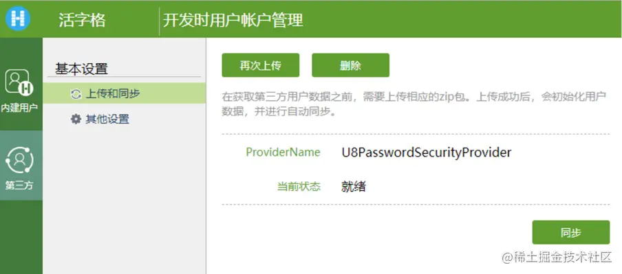 点击【第三方】-【上传】按钮,选择对应的第三方用户集成zip包,该zip包保存在集成文件包中的 \活字格文件夹下。