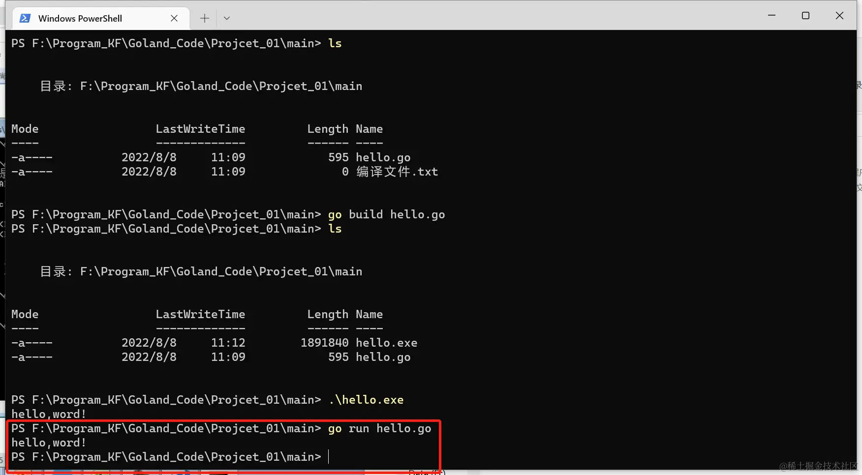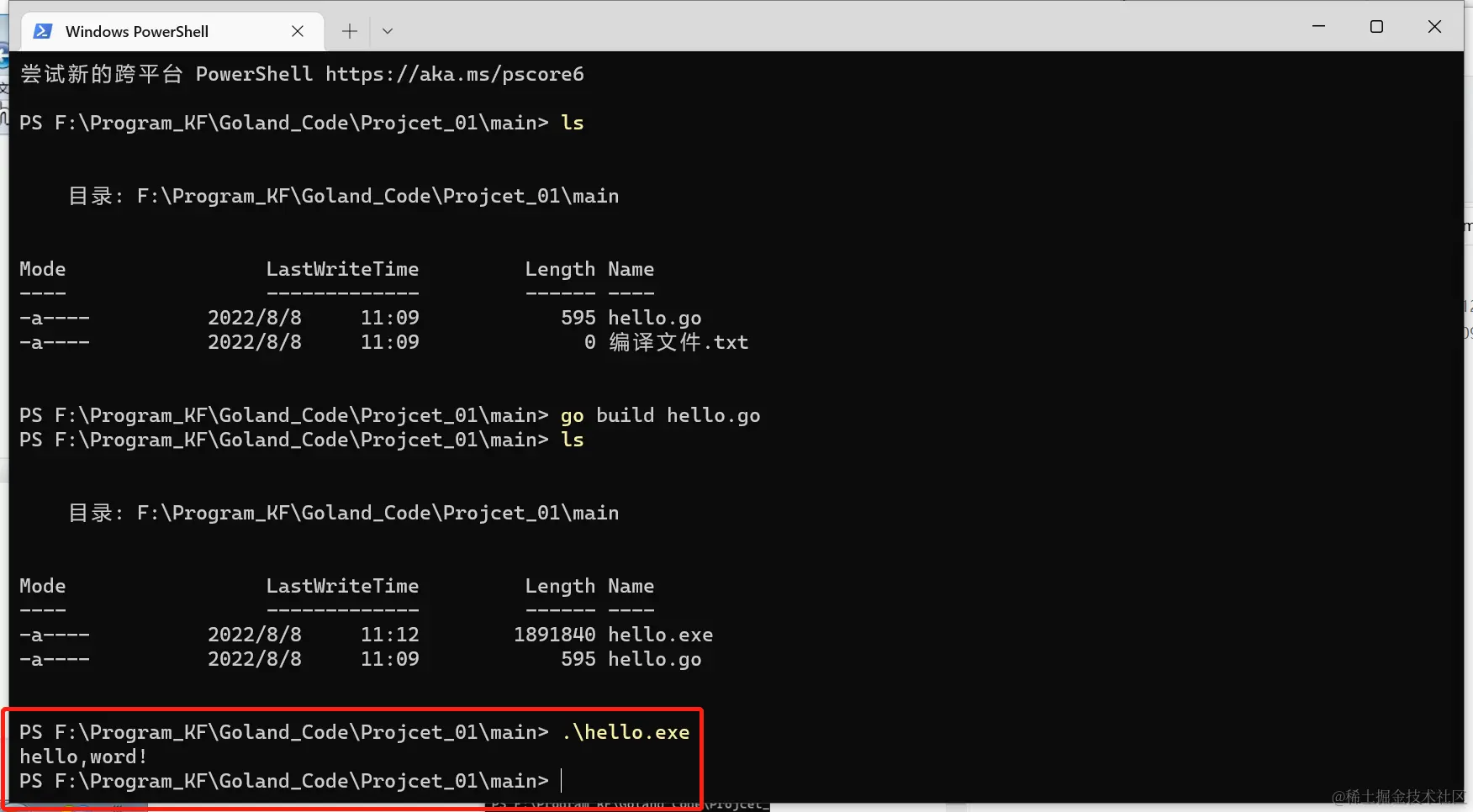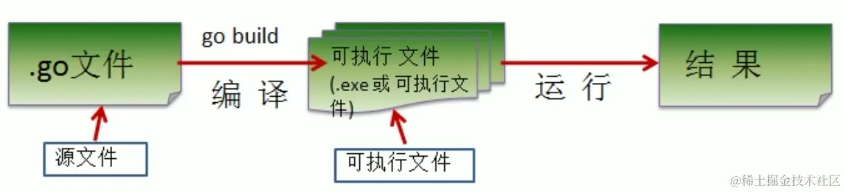 go build对hello.go文件进行编译。可以指定生成的可执行文件名,在Windows下,必须是.exe后缀。go bulid -o myhell.exe hello.go - 如果程序没有错误,没有任何提示,会在当前目录下会出现一个可执行文件(Windows 下是.exe | Linux 下是一个可执行文件),该文件是二进制码文件,也是可以执行的程序。